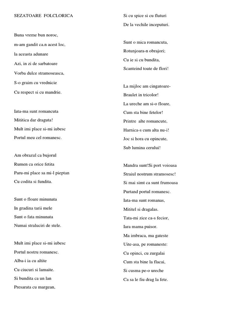 Romanas Si Romancute : Evenimet Cultural 2017 2018 - Poems in seven languages by poets such as eminescu, stanescu, cosbuc, paunescu, blaga, etc.. Din nou veti primi buline ca recompense pentru raspunsurile date. O poezie care descrie costumul popular românesc.sper să fie de folos pentru săptămâna viitoare. Sablon pentru orele de avap. La mulți ani, tuturor românilor! Ce contenu a été téléchargé par les utilisateurs si vous souhaitez signaler un contenu inapproprié, veuillez utiliser le lien en haut de la page: